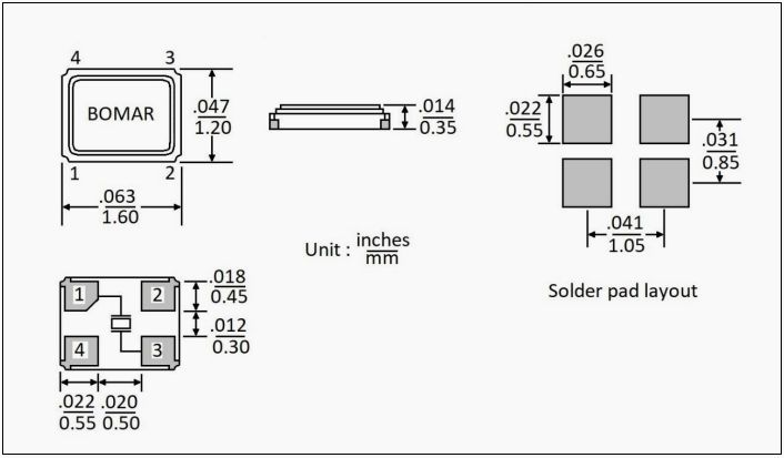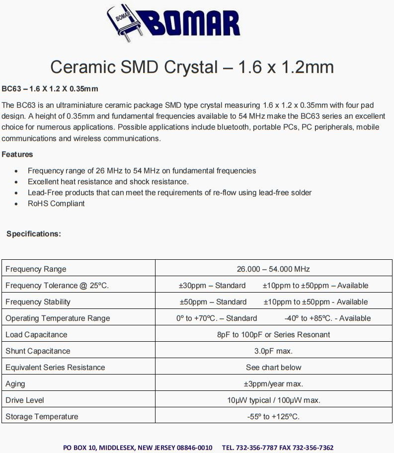 Bomar無源晶振,BC41EFD120-37.400000四腳晶振,無人機信號接收器晶振,美國Bomar晶振公司,進口晶振,歐美晶振,BC63晶振,1612晶振,石英晶振,超小型晶振,無源晶振,貼片晶振,四腳晶振,6G路由器晶振,6G通訊設備晶振,BC63是一款尺寸為1.6 x 1.2 x 0.35mm的超微型陶瓷封裝SMD型晶體,采用四焊片設計。0.35mm的高度和54 MHz的基頻使BC63系列成為眾多應用的絕佳選擇??赡艿膽冒ㄋ{牙、便攜式個人電腦、個人電腦外圍設備、移動通信和無線通信