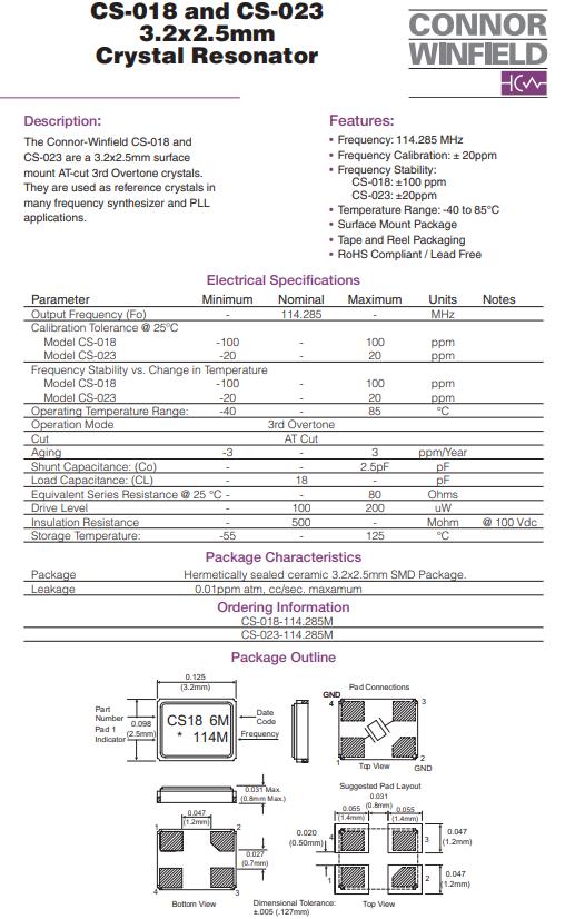 | CS-018-114.285MHZ | Connor-Winfield晶振 | CS-018 | 114.285MHz | ±100ppm | ±100ppm | 18pF |