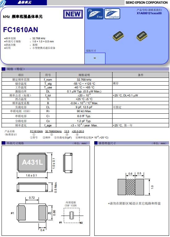 X1A000121000600|9pF|32.768KHz|1610mm|20ppm,X1A000121000600晶振,負(fù)載電容9pF,頻率32.768KHz,尺寸大小1610mm,精度20ppm,超小型封裝晶振,小型便攜式通訊設(shè)備晶振,兩腳貼片晶振,智能手機(jī)晶振,平板電腦晶振,數(shù)碼相機(jī)晶振.