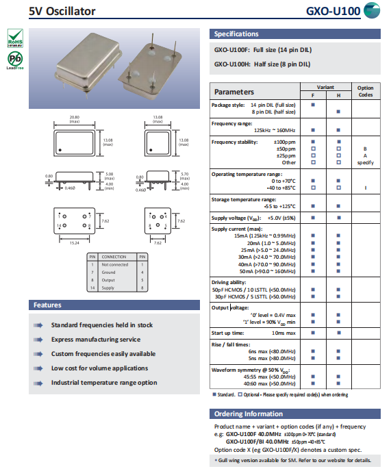 GXO-U100F/BI 40.0MHz-歐美Golledge晶振-四腳插件晶振,參數(shù)圖