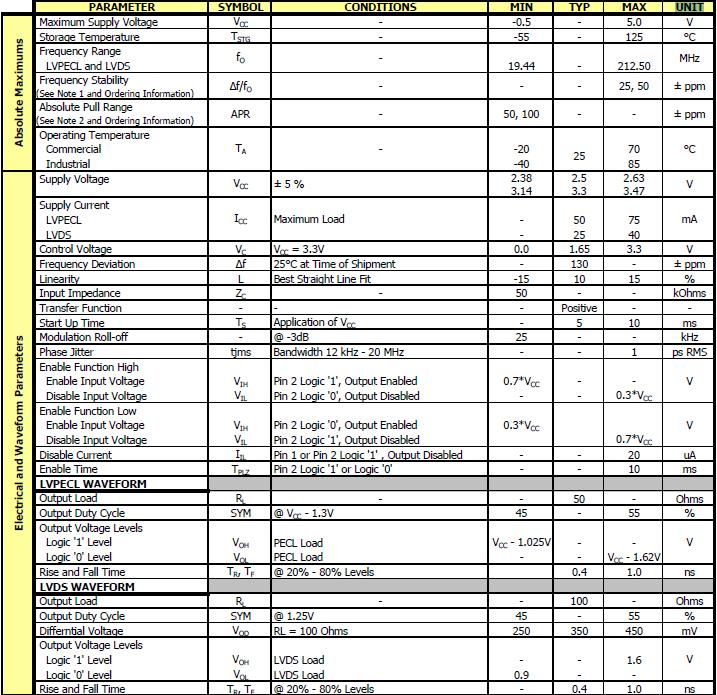 - 產(chǎn)品描述:進(jìn)口美國原裝品牌晶振,標(biāo)準(zhǔn)7x5mm表面山足跡,微分LVPECL或LVDS輸出,頻率范圍19.44 - 212.50 MHz頻率穩(wěn)定度,±50 ppm標(biāo)準(zhǔn)(±25 ppm可用),2.5 + 2.5 vdc或+直流操作,操作溫度為-40°C + 85°C,允許輸出標(biāo)準(zhǔn),低相位抖動(dòng),N...
