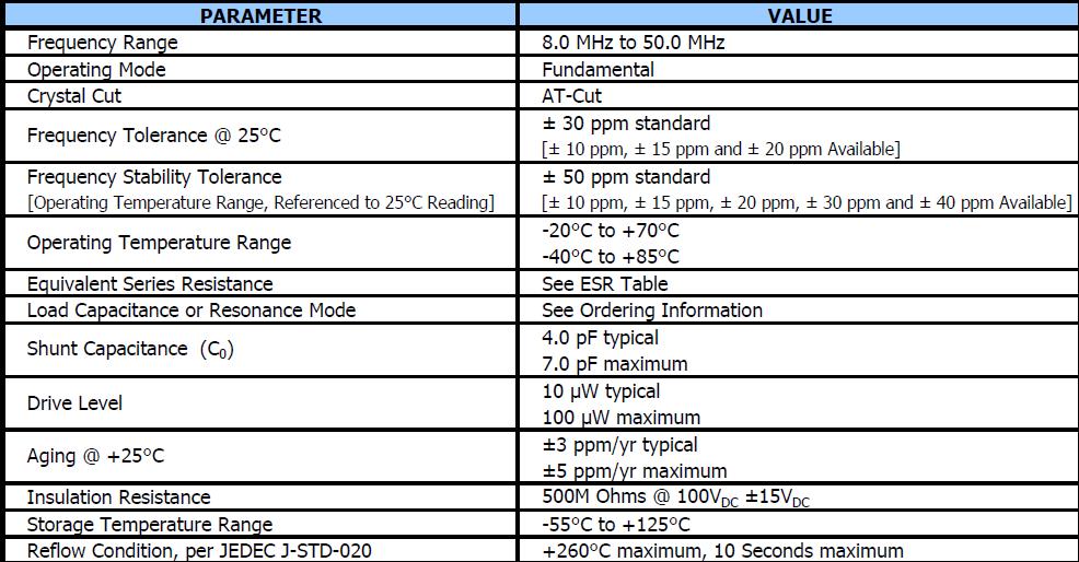 頻率范圍8~50 MHz,頻率公差,±30 ppm標(biāo)準(zhǔn)(其他公差),頻率穩(wěn)定度,±50 ppm標(biāo)準(zhǔn),(其他穩(wěn)定性),操作溫度為-40°C + 85°C,穩(wěn)定溫度和驅(qū)動(dòng)頻率水平,磁帶和卷軸包裝標(biāo)準(zhǔn),eia - 481,符合RoHS /綠(6/6)