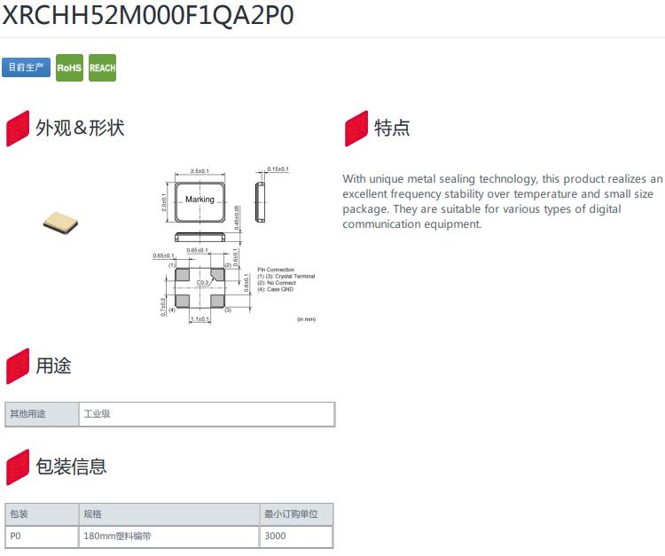 XRCHH52M000F1QA2P0|52M|-30~85℃|10ppm|8pf ,XRCHH52M000F1QA2P0晶振,頻率52M,工作溫度-30~85℃,精度10ppm,負(fù)載8pf,2520mm小體積晶振,金屬密封包裝晶振,數(shù)字通信設(shè)備晶振,醫(yī)療設(shè)備晶振,智能家具晶振,藍(lán)牙模塊晶振.