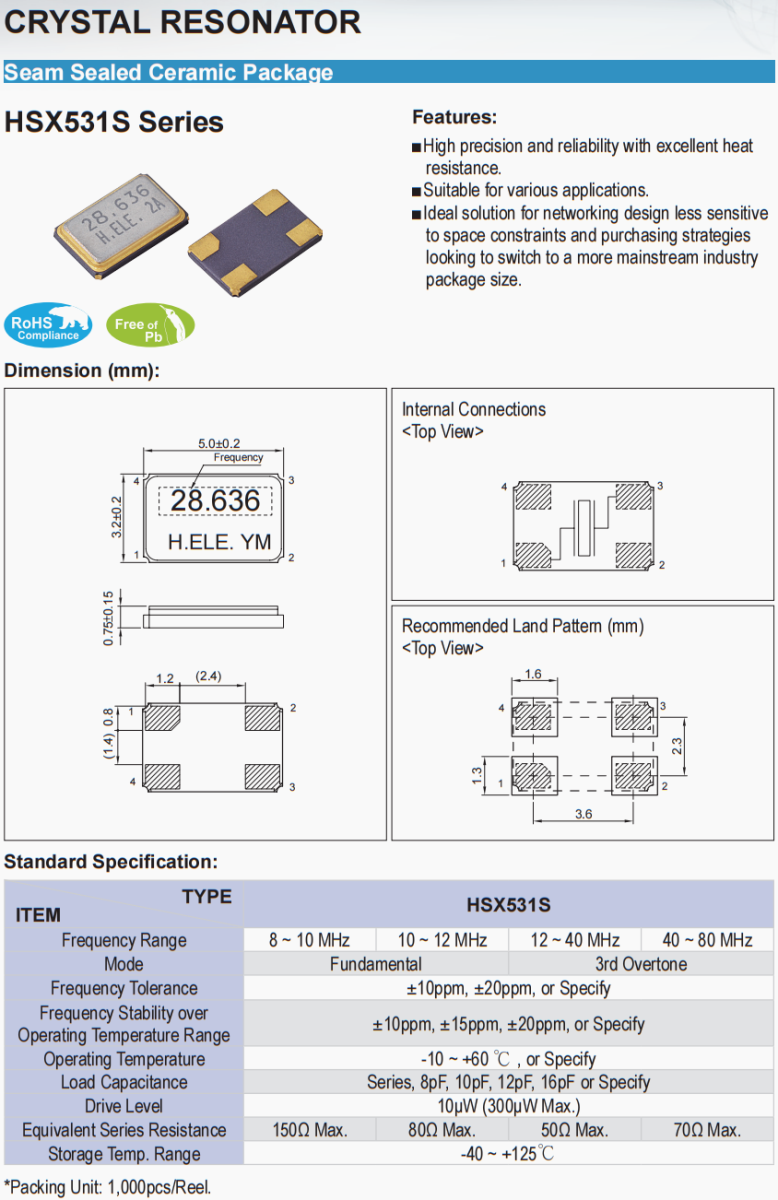 | X1H008000DK1H-X | 加高晶振 | HSX531S | 8 MHz | ±50ppm | 20pF |