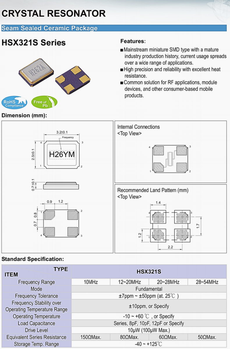 | X3S026000BZ1HZ-HU | 加高晶振 | HSX321S | 26 MHz | ±10ppm | 12pF | -20°C ~ 70°C |