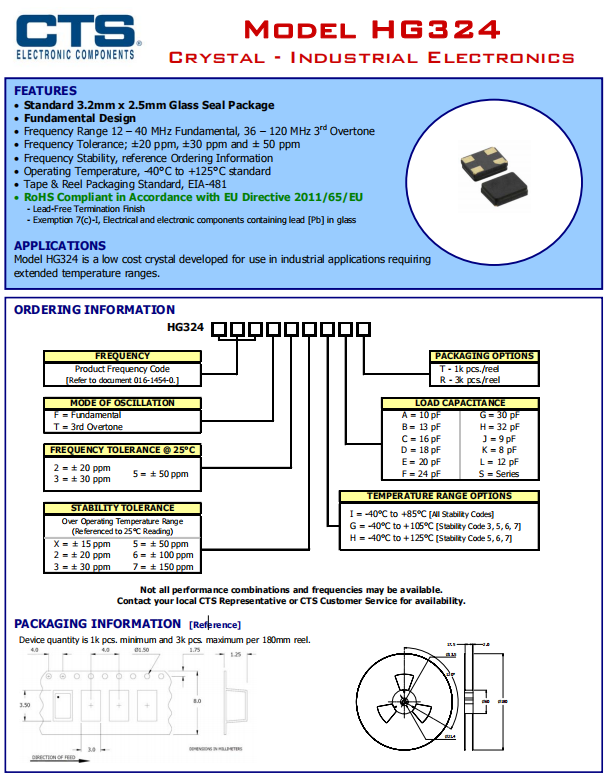 HG324240F23GCT晶振就是CTS晶振公司為需要擴(kuò)展溫度范圍的工業(yè)應(yīng)用開發(fā)的一款型號為HG324的無源晶振,石英晶體,尺寸3.2*2.5mm,頻率范圍12·120MHz,工作溫度可以選-40~125°C,-40~105°C,-40~85°C,頻率穩(wěn)定性強(qiáng),體積小,耐熱性好,是一種低成本的SMD石英晶體,由于它用途廣泛,一經(jīng)上市,就受到了廣大客戶群體的喜歡。