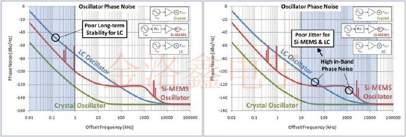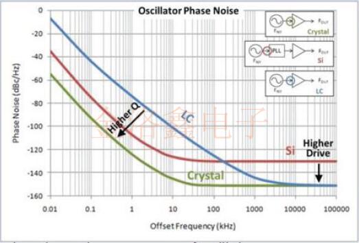 首先,在載波附近(低頻帶側(cè))的斜率梯度的差異很大程度上取決于振蕩源的Q值.Q值特別高的晶體具有高達(dá)100kHz的偏移頻率的低相位噪聲特性,而LC振蕩的Q值不超過(guò)100的極低的LC振蕩特性在載波附近(低頻段)具有方面)趨于惡化.相反,無(wú)論振蕩源如何,斜率的高頻帶側(cè)都很大程度上受到電路發(fā)射噪聲的影響.這樣,當(dāng)信號(hào)元素大于噪聲元素時(shí),地板水平趨于降低.尤其是LC振蕩具有大的輸出幅度和顯著的信號(hào)強(qiáng)度,因此在高頻帶側(cè)相位噪聲趨于減小.相比之下,可施加到Si諧振器的功率有限制,導(dǎo)致輸出幅度小和信號(hào)強(qiáng)度弱,與諧振器或LC振蕩相比,它們?cè)诟哳l段一側(cè)的理想度降低.當(dāng)然,降低高頻帶側(cè)的相位噪聲的另一種方法將是增加功率消耗,從而增加信號(hào)強(qiáng)度并降低地板水平.這種方法在改善相位噪聲與保持低功耗之間產(chǎn)生了相互取舍.