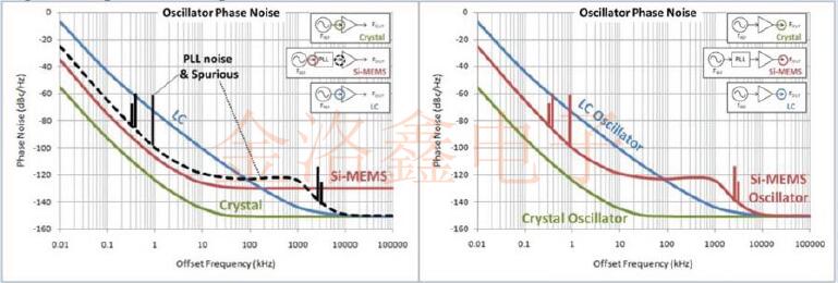 最后,對(duì)于三種類(lèi)型的振蕩器,使用晶體單元作為振蕩源的基本諧波振蕩器,使用PLL電路設(shè)計(jì)和Si諧振器的Si-MEMS振蕩器,其相位噪聲特性相對(duì)于輸出的趨向圖5的右側(cè)顯示了作為振蕩源的LC振蕩器(使用LC振蕩作為振蕩源).
