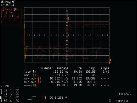請注意,PLL的頻率(垂直軸)顯示出50%的過沖.這種稍微欠阻尼的響應(yīng)是一種折衷,可以實(shí)現(xiàn)更快的壓擺率容限和適中的捕獲范圍.LeCroy示波器可以通過多種方式用于PLL測量.現(xiàn)代的高性能微處理器通常使用內(nèi)部PLL來倍增系統(tǒng)時鐘頻率.制造商指定系統(tǒng)時鐘允許的最大周期到周期的變化.典型的規(guī)格是最大抖動峰峰值小于250ps.由于無法訪問PLL的輸出,因此重要的是系統(tǒng)時鐘輸入必須滿足此規(guī)范.工程師可以使用Jitter Track逐周期測量系統(tǒng)時鐘來驗證系統(tǒng)時鐘是否符合此規(guī)格.如圖3所示.在100us記錄中,最大周期與周期周期之差為70ps.可直接從Jitter Track周期讀取該值,以在軌跡C中循環(huán)波形.垂直參數(shù)光標(biāo)之間的區(qū)域標(biāo)記為最大值.跡線A是所采集數(shù)據(jù)的縮放擴(kuò)展,顯示了兩個具有最大差異的相鄰周期.跡線B是Jitter Track周期,它讀取時鐘波形每個周期的絕對周期.