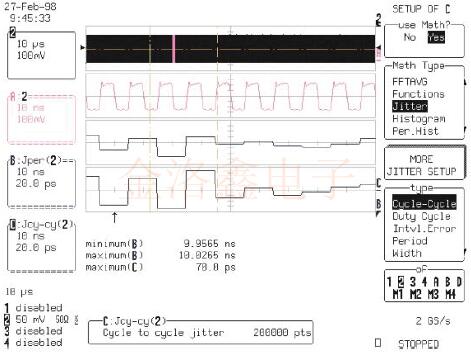 工程師可以使用Jitter Track逐周期測量系統(tǒng)時鐘來驗證系統(tǒng)時鐘是否符合此規(guī)格.如圖3所示.在100us記錄中,最大周期與周期周期之差為70ps.可直接從Jitter Track周期讀取該值,以在軌跡C中循環(huán)波形.垂直參數(shù)光標(biāo)之間的區(qū)域標(biāo)記為最大值.跡線A是所采集數(shù)據(jù)的縮放擴(kuò)展,顯示了兩個具有最大差異的相鄰周期.跡線B是Jitter Track周期,它讀取時鐘波形每個周期的絕對周期.