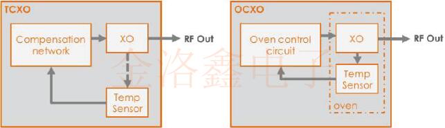 TCXO調(diào)整振蕩器的頻率,以補償由于溫度變化而發(fā)生的變化.為此,TCXO的主要元件是壓控晶體振蕩器(VCXO晶振).如下圖所示,該電路連接到檢測溫度并向振蕩器施加小的校正電壓的電路. 構(gòu)成整個溫度控制振蕩器的有5種不同的元器件: