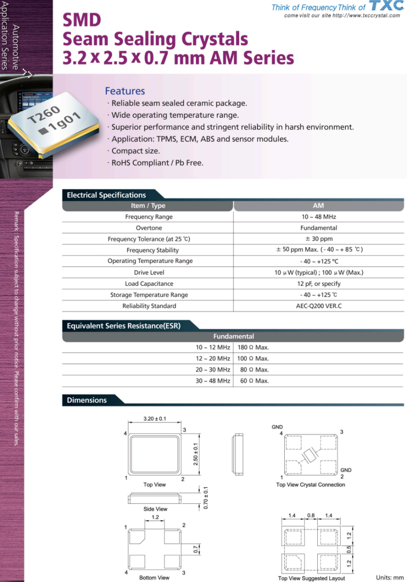 AM-48.000MAGE-T晶振,臺(tái)灣晶技晶振,汽車藍(lán)牙模塊晶振,臺(tái)灣TXC晶振,AM-48.000MAGE-T晶振,3225晶振,寬溫,汽車級晶振,無源晶振,無源晶振,石英晶體諧振器,四腳貼片晶振,超小型晶振,小型汽車晶振,車載收音機(jī)晶振,實(shí)時(shí)時(shí)鐘晶振,藍(lán)牙模塊晶振.特點(diǎn)可靠的縫密封陶瓷封裝。.工作溫度范圍寬。惡劣環(huán)境下的卓越性能和嚴(yán)格的可靠性應(yīng)用領(lǐng)域: TPMS,ECM,ABS和傳感器模塊。體積小巧。符合RoHS標(biāo)準(zhǔn)/不含Pb。AM系列貼片,接縫密封晶體,3.2 x2.5 x0.7毫米