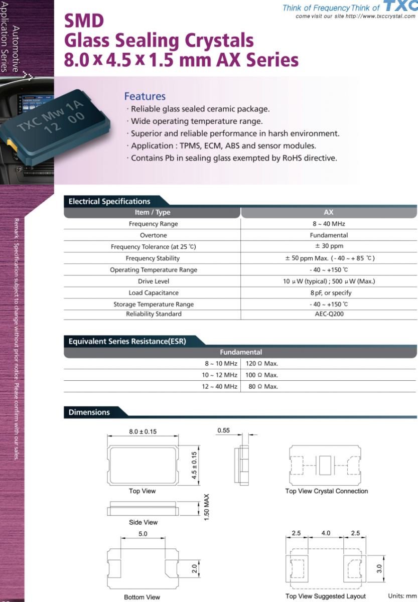 汽車(chē)導(dǎo)航系統(tǒng)晶振,TXC臺(tái)產(chǎn)晶體,AX-33.333MAGQ-T晶振,臺(tái)灣TXC晶振公司,汽車(chē)級(jí)晶振,無(wú)源晶振,車(chē)載USB晶振,高精度晶振,耐高溫晶振,高品質(zhì)晶振,臺(tái)產(chǎn)晶振,8045晶振,貼片晶振,陶瓷面晶振,二腳晶振,AX系列貼片玻璃密封晶體,8.0 x4.5 x 1.5毫米。特點(diǎn).可靠的玻璃密封陶瓷封裝。.工作溫度范圍寬。.惡劣環(huán)境下性能優(yōu)越、可靠。·應(yīng)用領(lǐng)域:TPMS,ECM,ABS和傳感器模塊。-不受RoHS指令限制的密封玻璃中含有鉛