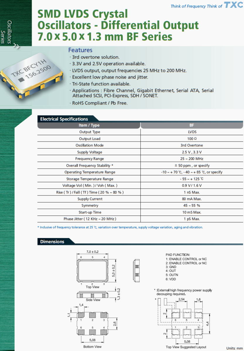 | BF-62.500MBE-T | TXC晶振 | BF | 62.5 MHz | LVDS | 3.3V | ±50ppm |