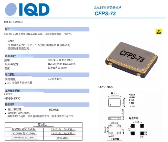 | LFSPXO018041REEL | IQD 進(jìn)口晶振 | CFPS-73 | XO (Standard) | 4 MHz | HCMOS | 3.3V | ±50ppm |