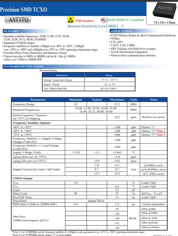 AST3TQ-20.00MHZ-5是一款封裝為7.0*5.0mm的溫補(bǔ)晶振,頻率20MHZ,電壓3.3V,輸出LVCMOS,標(biāo)準(zhǔn)可用頻率:10.00,12.80,19.20,20.00,25.00, 26.00, 30.72, 40.00, 50.00MHz,標(biāo)準(zhǔn)LVCMOS輸出,頻率穩(wěn)定性包括-40ºC到+85ºC的±100ppb,±280ppb,超過-50ºC至+90ºC和±500ppb超過-55ºC至+95ºC的工作溫度范圍,良好的相位噪聲,諧波和雜散含量,典型的rms抖動(dòng)400fs @ 40MHz載波和1.0ps @ 10MHz載波超過12kHz至20MHz BW.