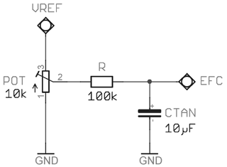 電位器POT應(yīng)該是低噪聲(金屬陶瓷或金屬薄膜)類型,其電阻值必須選擇這樣,即不超過VREF輸出的最大允許電流損耗。10 kΩ在大多數(shù)情況下是合適的,強(qiáng)烈建議在VC輸入處附加濾波。