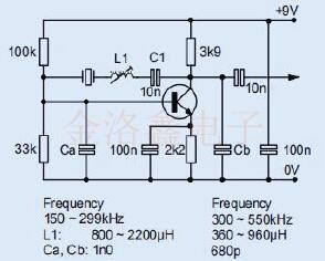 構(gòu)成同相放大器的兩個(gè)接地發(fā)射極晶體管提供了必要的增益,以保證在這些頻率下晶體的低活動(dòng)性時(shí)產(chǎn)生振蕩.L1和C2振蕩電路應(yīng)進(jìn)行調(diào)整以實(shí)現(xiàn)最大輸出,從而提供一定的選擇性并防止在錯(cuò)誤的石英晶振模式下產(chǎn)生振蕩.二極管D1和D2將晶體驅(qū)動(dòng)器限制在標(biāo)準(zhǔn)晶體的安全水平.為了進(jìn)行精細(xì)的頻率調(diào)整,Cc可以是微調(diào)器,其中間值應(yīng)近似等于平行校準(zhǔn)晶體的負(fù)載電容. 構(gòu)成同相放大器的兩個(gè)接地發(fā)射極晶體管提供了必要的增益,以保證在這些頻率下晶體的低活動(dòng)性時(shí)產(chǎn)生振蕩.L1和C2振蕩電路應(yīng)進(jìn)行調(diào)整以實(shí)現(xiàn)最大輸出,從而提供一定的選擇性并防止在錯(cuò)誤的晶振模式下產(chǎn)生振蕩.二極管D1和D2將晶體驅(qū)動(dòng)器限制在標(biāo)準(zhǔn)晶體的安全水平.為了進(jìn)行精細(xì)的頻率調(diào)整,Cc可以是微調(diào)器,其中間值應(yīng)近似等于平行校準(zhǔn)晶體的負(fù)載電容.