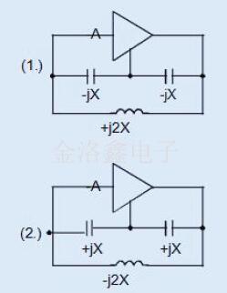 以上電路顯示了產(chǎn)生進(jìn)一步相位反轉(zhuǎn)所需的反饋網(wǎng)絡(luò).對(duì)于弧度的相移,網(wǎng)絡(luò)的要求是兩個(gè)串聯(lián)電抗的總和(不必相等)可以抵消第三個(gè)電抗.當(dāng)兩個(gè)臂共振時(shí)會(huì)發(fā)生這種情況.圖(1)表示被稱為Pierce振蕩器的結(jié)構(gòu)及其關(guān)系,即Colpitts和Clapp.圖(2.)代表Hartley和Miller.