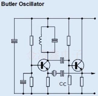 作為調(diào)諧振蕩器,巴特勒可用于高達(dá)100MHz的泛音晶體工作.但是,由于振蕩可能會(huì)通過晶體C0發(fā)生,因此建議使用一個(gè)較小的并聯(lián)電感器來消除這種振蕩.如果在振蕩電路的振蕩電路中放一個(gè)低阻抗抽頭,則可以省去發(fā)射極跟隨器.電路隨后變?yōu)榻拥卣袷幤?要使用基本模式晶體工作,可以用一個(gè)電阻器代替LC儲(chǔ)罐.
