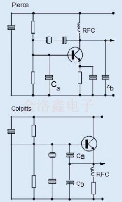 Pierce和Colpitts振蕩器的電路布置相似.電容器Ca和Cb與來自反饋網(wǎng)絡(luò)的晶體一起分別連接在相同的晶體管電極之間.兩個(gè)振蕩器的設(shè)計(jì)方程式相同,只是在哪個(gè)晶體管電極接地方面有所不同.