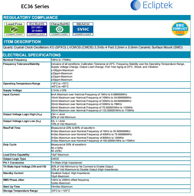Ecliptek | 表面貼裝晶體振蕩器 | Oscillator XO 125MHz ±20ppm 15pF LVCMOS 55% 2.5V 4-Pin CSMD Bulk |