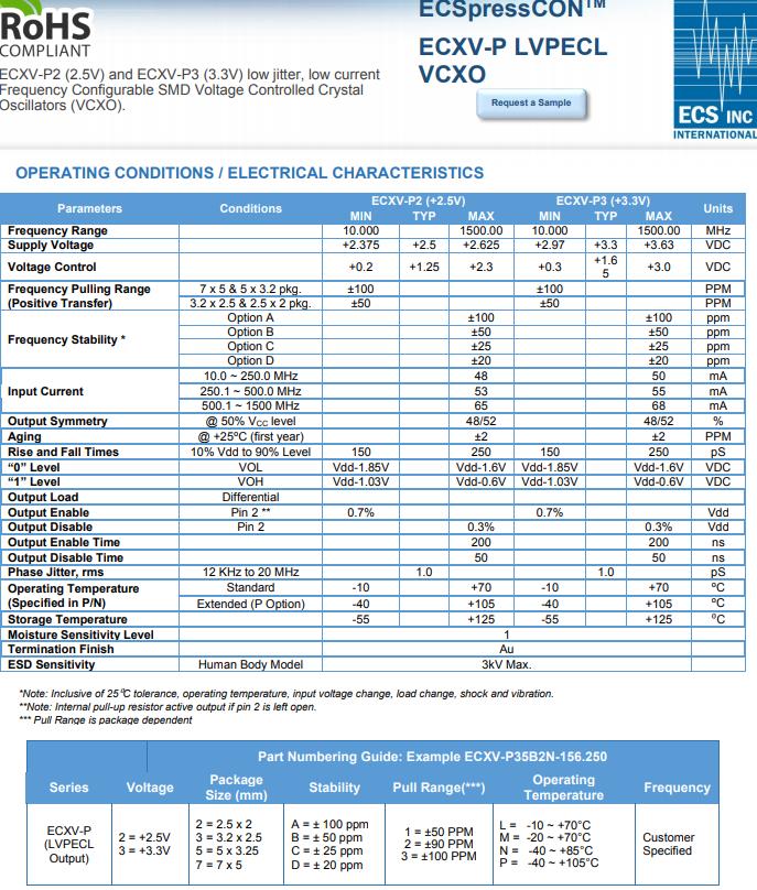 Frequency Range 10.000 1500.00 10.000 1500.00 MHz Supply Voltage +2.375 +2.5 +2.625 +2.97 +3.3 +3.63 VDC Voltage Control +0.2 +1.25 +2.3 +0.3 +1.6 5 +3.0 VDC Frequency Pulling Range (Positive Transfer) 7 x 5 & 5 x 3.2 pkg. ±100 ±100 PPM 3.2 x 2.5 & 2.5 x 2 pkg. ±50 ±50 PPM Frequency Stability * Option A ±100 ±100 ppm Option B ±50 ±50 ppm Option C ±25 ±25 ppm Option D ±20 ±20 ppm Input Current 10.0 ~ 250.0 MHz 48 50 mA 250.1 ~ 500.0 MHz 53 55 mA 500.1 ~ 1500 MHz 65 68 mA Output Symmetry @ 50% VCC level 48/52 48/52 % Aging @ +25?C (first year) ±2 ±2 PPM Rise and Fall Times 10% Vdd to 90% Level 150 250 150 250 pS “0” Level VOL Vdd-1.85V Vdd-1.6V Vdd-1.85V Vdd-1.6V VDC “1” Level VOH Vdd-1.03V Vdd-0.6V Vdd-1.03V Vdd-0.6V VDC Output Load Differential Output Enable Pin 2 ** 0.7% 0.7% Vdd Output Disable Pin 2 0.3% 0.3% Vdd Output Enable Time 200 200 ns Output Disable Time 50 50 ns Phase Jitter, rms 12 KHz to 20 MHz 1.0 1.0 pS Operating Temperature (Specified in P/N) Standard -10 +70 -10 +70 ?C Extended (P Option) -40 +105 -40 +105 ?C Storage Temperature -55 +125 -55 +125 ?C Moisture Sensitivity Level 1 Termination Finish Au ESD Sensitivity Human Body Model 3kV Max. Part Numbering Guide: Example ECXV-P35B2N-156.250 Series Voltage Package Size (mm) Stability Pull Range(***) Operating Temperature Frequency ECXV-P (LVPECL Output) 2 = +2.5V 3 = +3.3V 2 = 2.5 x 2 3 = 3.2 x 2.5 5 = 5 x 3.25 7 = 7 x 5 A = ± 100 ppm B = ± 50 ppm C = ± 25 ppm D = ± 20 ppm 1 = ±50 PPM 2 = ±90 PPM 3 = ±100 PPM L = -10 ~ +70°C M = -20 ~ +70°C N = -40 ~ +85°C P = -40 ~ +105°C Customer Specified OPERATING CONDITIONS / ELECTRICAL CHARACTERISTICS ECXV-P2 (2.5V) and ECXV-P3 (3.3V) low jitter, low current Frequency Configurable SMD Voltage Controlled Crystal Oscillators (VCXO). ECSpressCONTM ECXV-P LVPECL VCXO Request a Sample *Note: Inclusive of 25?C tolerance, operating temperature, input voltage change, load change, shock and vibration
