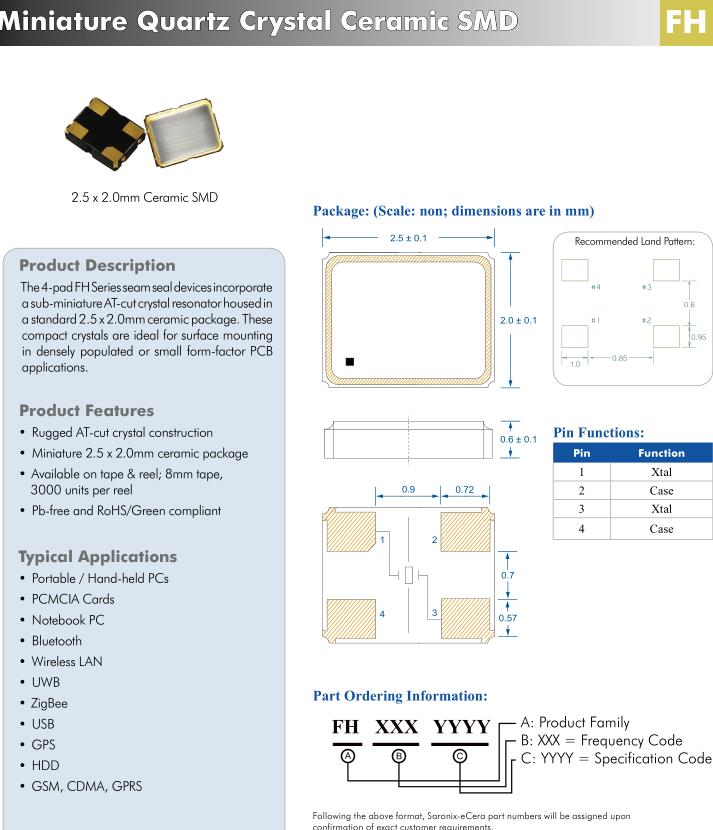 4-pad FH系列接縫密封裝置微型AT-cut石英晶體諧振器標準2.5 x 2.0mm陶瓷封裝。這些致密晶體是表面安裝的理想選擇在人口密集或小形狀因素PCB應用程序。