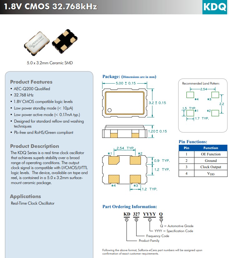 百利通亞陶晶振KDQ系列1.8V,小體積尺寸5.0x3.2mm貼片晶振、32.768kHz、汽車級CMOS晶體振蕩器,KDQ系列是一種實時時鐘振蕩器,可在廣泛的工作條件下實現(xiàn)卓越的穩(wěn)定性。輸出時鐘信號與 LVCMOS/LVTTL邏輯電平兼容。該器件采用卷帶包裝,采用 5.0 x 3.2mm 表面貼裝陶瓷封裝。