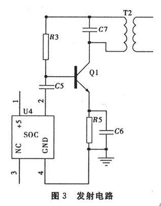 如圖3,無(wú)線充電器主振電路采用2 MHz有源晶振作為振蕩器。有源晶振輸出的方波,經(jīng)過二階低通濾波器濾除高次諧波,得到穩(wěn)定的正弦波輸出,經(jīng)三極管13003及其外圍電路組成的丙類放大電路后輸出至線圈與電容組成的并聯(lián)諧振回路輻射出去.為接收部分提供能量。