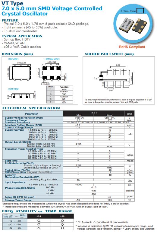 | VTEUPLJANF-25.000000 | 臺灣泰藝晶體 | VT | VCXO | 25MHz | 3.3V |