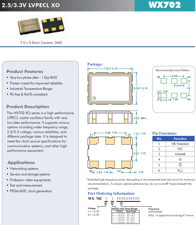 | WX702 | 標(biāo)準(zhǔn) | PECL | 3.32.5 | 20~50 | 50 至 212.5 | <1 | 6 | - | 2.5V/3.3V、7.0x5.0mm、PLL LVPECL 晶體振蕩器 |