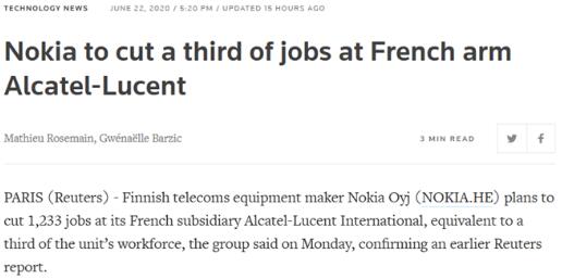 這次諾基亞一次性裁員1000多人,也會(huì)間接給供應(yīng)鏈造成一定的影響,業(yè)務(wù)量減少訂單同樣也會(huì)變少.諾基亞這一裁員聲明公布于各國(guó)積極部署5G移動(dòng)網(wǎng)絡(luò)之際,與此同時(shí),這則聲明在疫情發(fā)展未見(jiàn)明朗的法國(guó)引發(fā)了一定程度的政治反響,因?yàn)橹Z基亞在5年前買下Alcatel-Lucent時(shí),曾承諾保留工作崗位.據(jù)悉,承諾保留工作崗位這一條件加速了法國(guó)監(jiān)管機(jī)構(gòu)對(duì)該項(xiàng)收購(gòu)交易的審批.