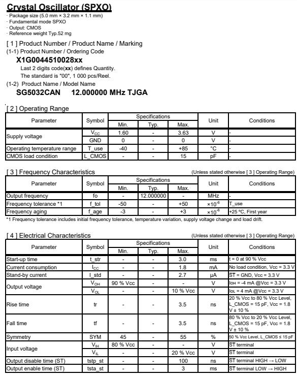 | X1G004451002800 | SG5032CAN | 12.000000 MHz | 5.00 x 3.20 x 1.10 mm | CMOS | 1.620 to 3.630 V | -40 to 85 °C | +/-50 ppm |