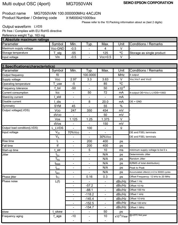 | X1M000421000300 | MG7050VAN | 156.250000 MHz | 7.00 x 5.00 x 1.60 mm | LVDS | 2.970 to 3.630 V | 0 to 70 °C |