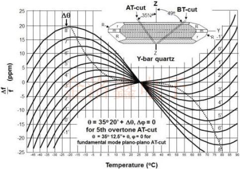 可以選擇三個不同的角度來優(yōu)化不同范圍內(nèi)的性能.較低的角度可用于-20℃~+70℃的溫度范圍,應(yīng)選擇較大的角度以適用于較寬的溫度范圍.在給定的溫度范圍內(nèi),在更嚴(yán)格的公差(較小的ppm偏移)范圍內(nèi)的性能受到曲線本身以及角度切割精度的限制.好的切割精度可以低至1至2分鐘,而測量精度則可以精確至0.1分鐘.與該過程有關(guān)的擴(kuò)散和為3分鐘以上的時間增加的成本增加了成本.曲線允許對溫度范圍的公差進(jìn)行理論限制.注意不要指定不可能的情況.