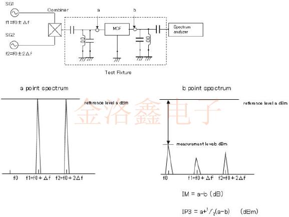 說明濾波器的重要特性——互調(diào)制.手機、電視、收音機等接收電波的設(shè)備,除了希望的電波外,其他強大的電波也同時到來.此時,電路中如果有非線性(輸出與輸入不成比例),就會發(fā)生互調(diào)這種有害現(xiàn)象.線性時,電路的輸出波用輸入波的一次函數(shù)表示,非線性時,會產(chǎn)生次數(shù)高的項,其中次數(shù)為奇數(shù)的項會發(fā)生互調(diào)(次數(shù)為偶數(shù)的項稱為高次諧波). 互調(diào)與三階交調(diào)點之間的關(guān)系:
