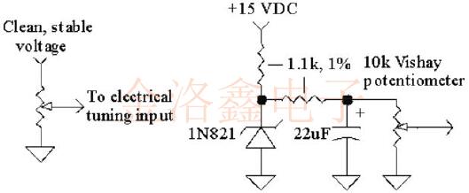 作為一種選擇,可以將振蕩器的內(nèi)部參考電壓引致一個(gè)引腳上,以連接到多圈電位計(jì)以進(jìn)行微調(diào).或者,可以將來(lái)自單獨(dú)電源的干凈DC施加到電調(diào)諧銷(xiāo)上.如果可用電源有噪聲或不穩(wěn)定,則可能需要添加一個(gè)齊納二極管或參考設(shè)備以及一個(gè)低通噪聲濾波器.溫度補(bǔ)償齊納二極管(如1N821)是提供良好溫度穩(wěn)定性和極低噪聲的絕佳選擇(在大多數(shù)情況下),以下所示的22uF濾波電容器可省去.參考設(shè)備具有出色的穩(wěn)定性,但它們通常具有相當(dāng)高的噪聲電壓,因此建議進(jìn)行額外的濾波器. 這里有幾點(diǎn)要考慮: