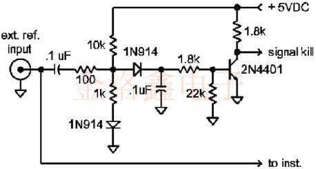 信號(hào)殺死輸入通常接受普通的TTL電平,但可以輕松配置為自定義開(kāi)關(guān)電平.大多數(shù)信號(hào)殺死輸入均設(shè)計(jì)為在末連接時(shí)浮動(dòng)至"開(kāi)"狀態(tài),內(nèi)部RC電路可保護(hù)晶振免受可能存在于控制線上有有害電壓或干擾RF信號(hào)的侵害.下面顯示的電路將檢測(cè)到存在大于1伏pp的外部基準(zhǔn),并產(chǎn)生適合驅(qū)動(dòng)大多數(shù)信號(hào)殺死輸入的邏輯"低".該控制信號(hào)還可用于門(mén)控儀器電路的外部輸入.該電路設(shè)計(jì)為表現(xiàn)出相當(dāng)高的輸入阻抗,因此在儀器的其他位置假設(shè)電纜端接正確. 如果期望內(nèi)部振蕩器具有比外部基準(zhǔn)更好的短期穩(wěn)定性,則可能需要將內(nèi)部振蕩器相位鎖定到基準(zhǔn).鎖定的振蕩器將表現(xiàn)出內(nèi)部晶體振蕩器的良好短期穩(wěn)定性和外部基準(zhǔn)的良好長(zhǎng)期穩(wěn)定性.一個(gè)簡(jiǎn)單的一階環(huán)路可以由三態(tài)總線設(shè)備或模擬開(kāi)關(guān)以及一些其他部件組成.基本概念是利用外部參考信號(hào)驅(qū)動(dòng)三態(tài)控制,并使內(nèi)部振蕩器信號(hào)通過(guò)三態(tài)門(mén)之一,以便參考信號(hào)對(duì)內(nèi)部振蕩器信號(hào)進(jìn)行采樣.三態(tài)門(mén)的輸出經(jīng)過(guò)低通濾波以消除RF頻率,并連接到內(nèi)部振蕩器的電調(diào)諧.偏置三態(tài)控制線,以便在沒(méi)有外部基準(zhǔn)時(shí)柵極輸出"浮動(dòng)".當(dāng)沒(méi)有外部參考源時(shí),這種高阻抗?fàn)顟B(tài)允許調(diào)諧線被連接到調(diào)諧電位器的高阻值電阻拉動(dòng).74HC244具有兩組四個(gè)三態(tài)緩沖器,是一個(gè)不錯(cuò)的選擇,因?yàn)榭梢允褂梦词褂玫乃膫€(gè)門(mén)來(lái)緩沖信號(hào).