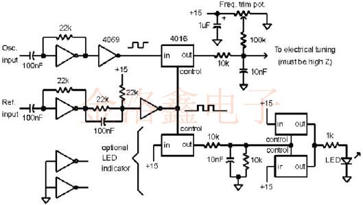 以下電路使用相同的Wenzel晶振技術(shù),僅使用兩個(gè)CMOS器件,一個(gè)4069十六進(jìn)制反相器和一個(gè)4016或4066模擬開(kāi)關(guān).頻率微調(diào)電位器在不存在基準(zhǔn)的情況下控制頻率.該電路還包括一個(gè)LED驅(qū)動(dòng)器,用于指示外部參考信號(hào)的存在.組分值不是特別關(guān)鍵,并且最佳值將取決于應(yīng)用. 所示電路是具有最高精度振蕩器的一階環(huán)路.例如,一個(gè)10MHz的烤箱振蕩器調(diào)諧靈敏度可能為每伏特1Hz,如果使用15V電源,則相位斜率約為每弧度3伏特.一階環(huán)路的帶寬是調(diào)諧靈敏度和相位斜率的乘積(1Hz/伏×3伏/弧度=3Hz),該斜率遠(yuǎn)低于10K和10nF網(wǎng)絡(luò)的滾降頻率.如果振蕩器具有更高的調(diào)諧靈敏度,則帶寬將成比例地更高,并且可能需要二階響應(yīng)來(lái)減少外部參考噪聲.盡管可以添加傳統(tǒng)的有損集成運(yùn)算放大器類(lèi)型2電路,在沒(méi)有基準(zhǔn)的情況下,有必要采取其他措施來(lái)控制頻率,因?yàn)榉e分器將趨向于漂移至供電軌之一.