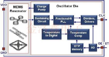 MEMS振蕩器由與模擬振蕩器IC封裝在一起的MEMS諧振器芯片組成.如圖1左側(cè)所示,有不同類型的MEMS諧振器可滿足不同的應(yīng)用需求.MEMS諧振器連接到模擬IC上的MEMS Oscillator專用電路塊,并通過(guò)靜電激勵(lì)驅(qū)動(dòng).