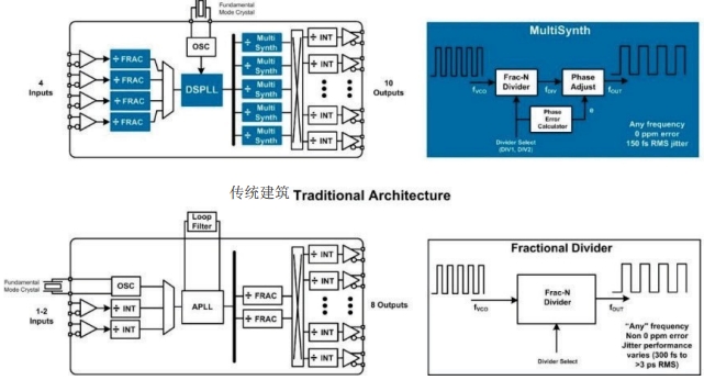 第四代DSPLL與傳統(tǒng)高性能時(shí)鐘架構(gòu)Si5345/44/42抖動(dòng)衰減器利用獨(dú)特的專有架構(gòu),與傳統(tǒng)時(shí)鐘架構(gòu)相比,具有更高的頻率靈活性,更低的抖動(dòng),更低的相位噪聲和更好的雜散性能.這些新器件采用最先進(jìn)的工藝技術(shù)設(shè)計(jì),適用于任何獨(dú)立的時(shí)鐘器件(55納米CMOS),使得在單一統(tǒng)一架構(gòu)中提供無(wú)與倫比的性能和頻率合成靈活性成為可能.Si5345支持靈活的輸入級(jí),每個(gè)時(shí)鐘輸入具有獨(dú)立的小數(shù)分頻器.這種集成簡(jiǎn)化了器件與各種不同時(shí)鐘源(如BITS,SyncE,SONET/SDH,PDH,ASIC,FPGA)的接口.DSPLL提供抖動(dòng)衰減,任意頻率轉(zhuǎn)換,無(wú)中斷開關(guān)和保持功能.DSPLL將模擬LC-VCO與基于DSP的數(shù)字環(huán)路濾波器和數(shù)字鑒相器相結(jié)合.這種混合混合信號(hào)方法提供了兩全其美的優(yōu)勢(shì):在高度集成的數(shù)字可編程架構(gòu)中實(shí)現(xiàn)低相位噪聲和低抖動(dòng)時(shí)鐘合成.環(huán)路濾波器功能集成在片內(nèi),消除了分立濾波器元件,簡(jiǎn)化了PCB布局.Si5345器件支持集成快速鎖定特性,無(wú)論環(huán)路帶寬設(shè)置如何(<100毫秒),都能實(shí)現(xiàn)極快的PLL采集.除了消除與外部聲表濾波器元件相關(guān)的噪聲耦合之外,DSPLL帶寬在0.1Hz至4kHz范圍內(nèi)可由用戶編程,支持根據(jù)應(yīng)用選擇環(huán)路帶寬,同時(shí)將抖動(dòng)傳遞降至最低.相比之下,大多數(shù)傳統(tǒng)APLL解決方案需要分立環(huán)路濾波器,這種濾波器對(duì)電路板級(jí)噪聲非常敏感,會(huì)影響抖動(dòng)的產(chǎn)生,并增加PCB布局的復(fù)雜性.5|DSPLL驅(qū)動(dòng)五個(gè)獨(dú)立的多同步小數(shù)分頻器,這些分頻器通過(guò)非阻塞式交叉點(diǎn)開關(guān)連接到10路時(shí)鐘輸出陣列.在MultiSynth架構(gòu)的第一階段,Skyworks晶振的MultiSynth高速小數(shù)N分頻器在兩個(gè)最接近的整數(shù)分頻器值之間無(wú)縫切換,以產(chǎn)生精確的輸出時(shí)鐘頻率,頻率合成誤差為0ppm.為了消除此過(guò)程產(chǎn)生的相位誤差,MultiSynth會(huì)計(jì)算小數(shù)N分頻器產(chǎn)生的時(shí)鐘與所需輸出時(shí)鐘之間的相對(duì)相位差,并動(dòng)態(tài)調(diào)整相位以匹配理想時(shí)鐘波形.這種新穎的方法可以產(chǎn)生1kHz至800MHz范圍內(nèi)的任意輸出時(shí)鐘頻率,0ppm誤差,同時(shí)在整數(shù)模式下實(shí)現(xiàn)優(yōu)于100fsRMS的相位抖動(dòng)性能(12kHz至20MHz),在合成模式下實(shí)現(xiàn)小于150fs的性能,同時(shí)產(chǎn)生小數(shù)和整數(shù)相關(guān)時(shí)鐘.相比之下,傳統(tǒng)架構(gòu)依賴不執(zhí)行相位誤差消除的傳統(tǒng)小數(shù)分頻器,因此當(dāng)器件配置為產(chǎn)生小數(shù)輸出時(shí)鐘時(shí),輸出抖動(dòng)明顯更高.