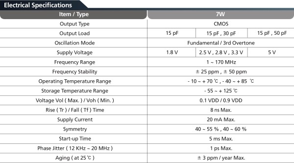 - 產(chǎn)品描述:臺灣進口7W晶振是7050封裝式石英晶體振蕩器,四個腳貼片式CMOS輸出晶振,電源電壓范圍1.8V~5V,覆蓋范圍廣是其高的精度的特征.其穩(wěn)定性好,低抖動及低功耗主要應(yīng)用于無線通信,PC,藍牙裝置等,符合ROHS及無鉛應(yīng)用.